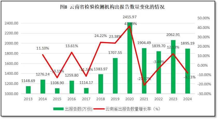 从图8来看,云南省检验检测机构对外出具的检验检测报告数量在2017年之前一直在1150万份左右波动,从2018年起开始增长,到2020年达到2415.97万份的峰值,之后再回落到1900万份左右波动。2021-2022年云南省检验检测报告数量连续下降,可能跟疫情带来影响有关。2023年,云南省检验检测机构共出具检验检测报告2062.91万份,数量有所反弹,但2024年度数据再次回落,降到1895.19万份。